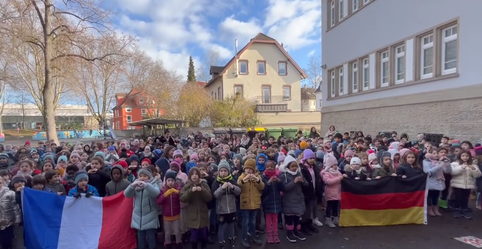 © Falkenhausenschule Anlässlich des 61. Geburtstags des deutsch-französischen Freundschaftsvertrags sangen die Schüler der Falkenhausenschule gemeinsam die Fantastikinder-Hymne auf dem Schulhof.